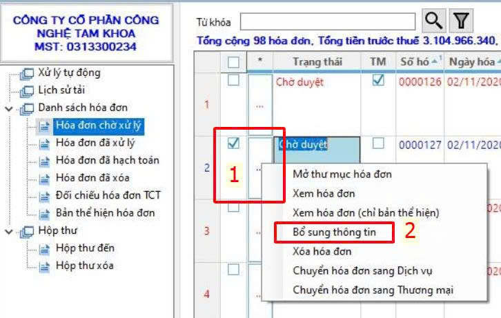 Lúc này, người dùng nhấn vào ô ba chấm trước dòng hóa đơn, chọn Bổ sung thông tin như hình dưới để vào giao diện xử lý bổ sung giá trị Tổng tiền trước thuế.