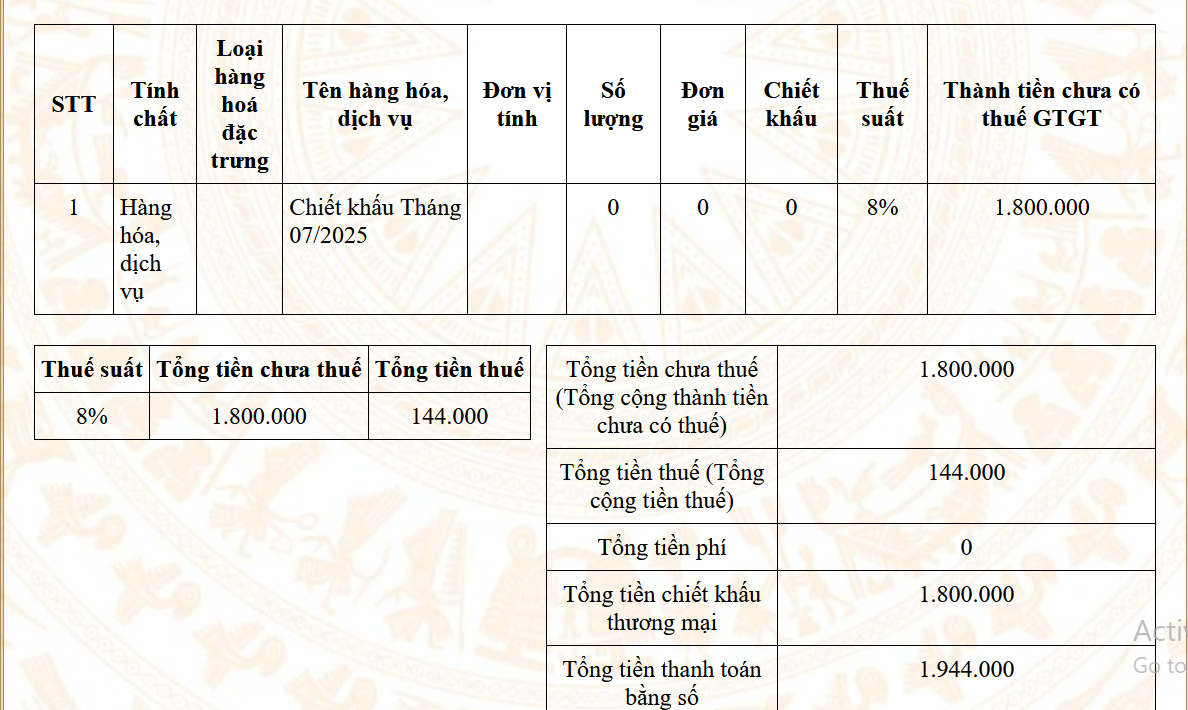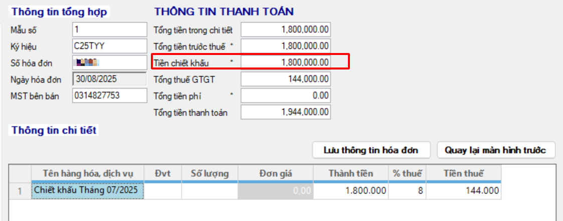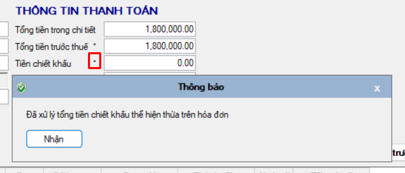* Trường hợp 2: Hóa đơn có chiết khấu, giá trị chiết khấu đã được tính vào Tiền chưa thuế rồi, nhưng lúc thể hiện vẫn thể hiện thêm Tổng tiền chiết khấu