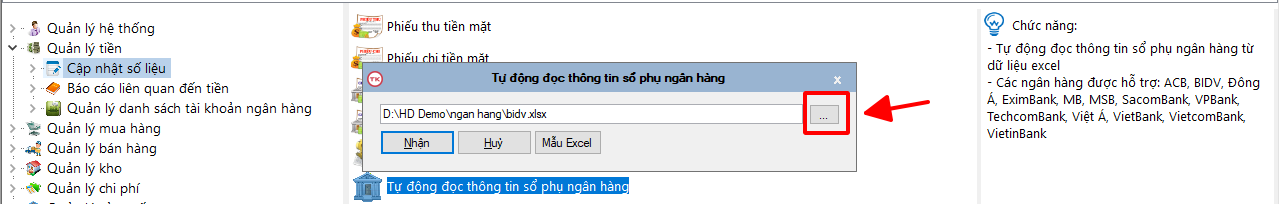 Đọc thông tin từ file excel sổ phụ ngân hàng đưa vào, bấm vào ô 3 chấm như hình dưới và chọn file sổ phụ ngân hàng cần đọc.