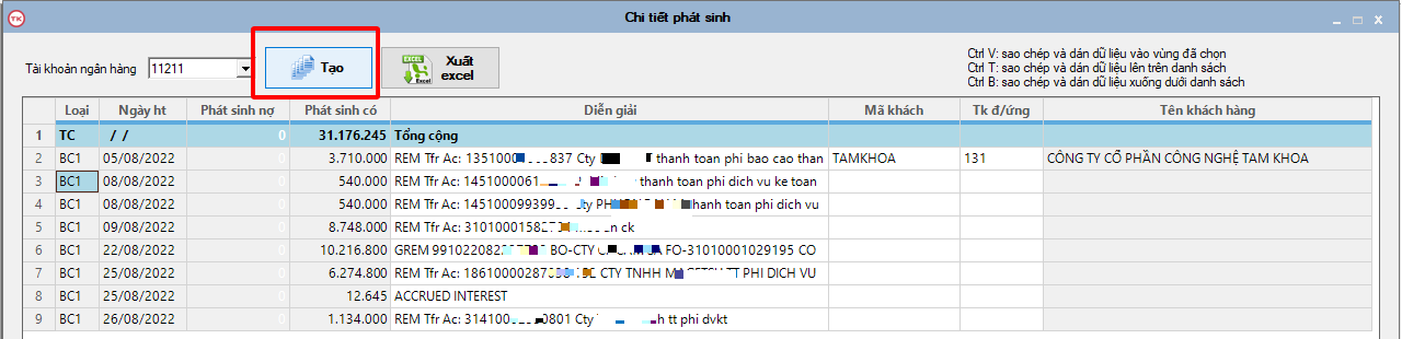 Phần mềm sẽ hiện giao diện chi tiết phát sinh của sổ phụ đó. Người dùng khai báo thêm mã khách và tài khoản đối ứng cùng tài khoản ngân hàng tương ứng.