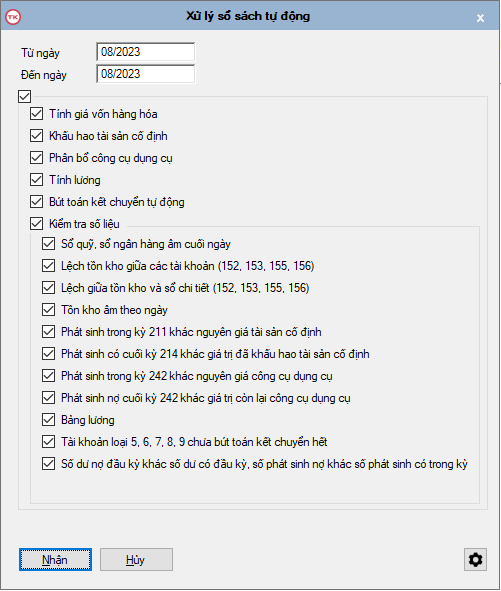 Tự động tính giá vốn hàng hóa, tính khấu hao TSCĐ và CCDC, tính lương, bút toán khấu hao, bút toán lương, bút toán kết chuyển tự động, kiểm tra đối chiếu dữ liệu.