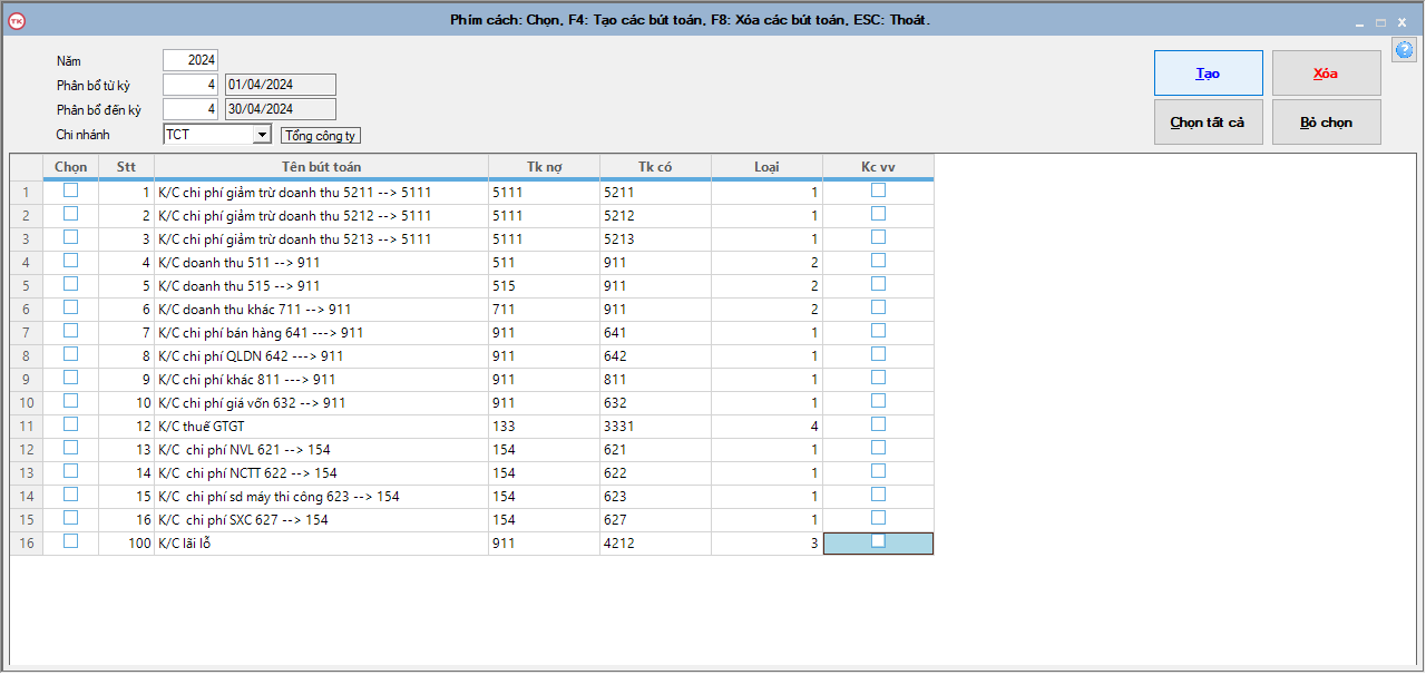 | 1 | Chứng từ tạo từ bút toán | – Cho phép chỉnh sửa và in chứng từ kế toán tạo từ bút toán kết chuyển.