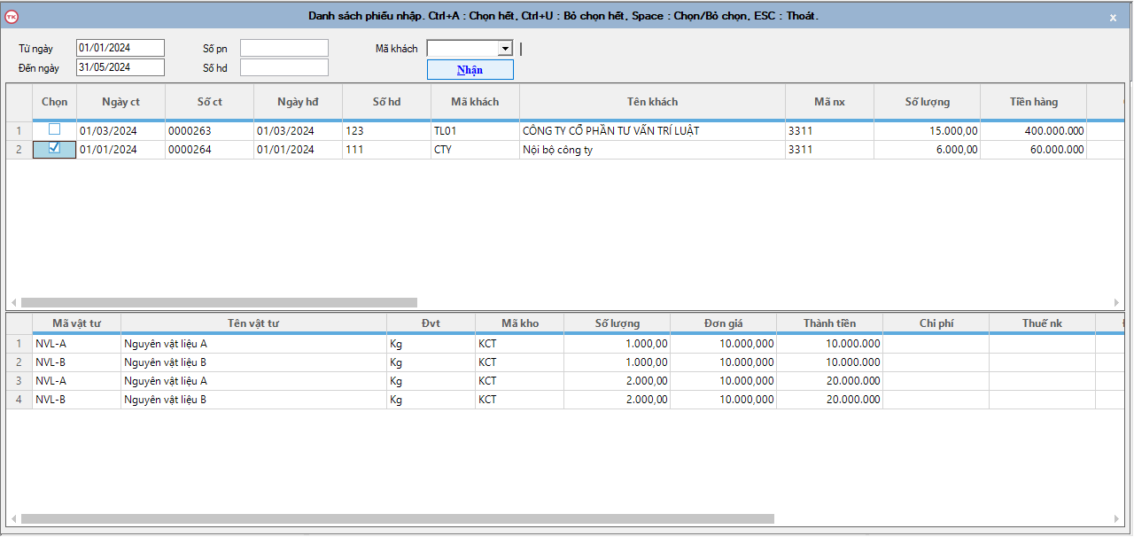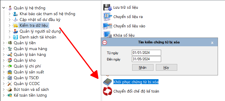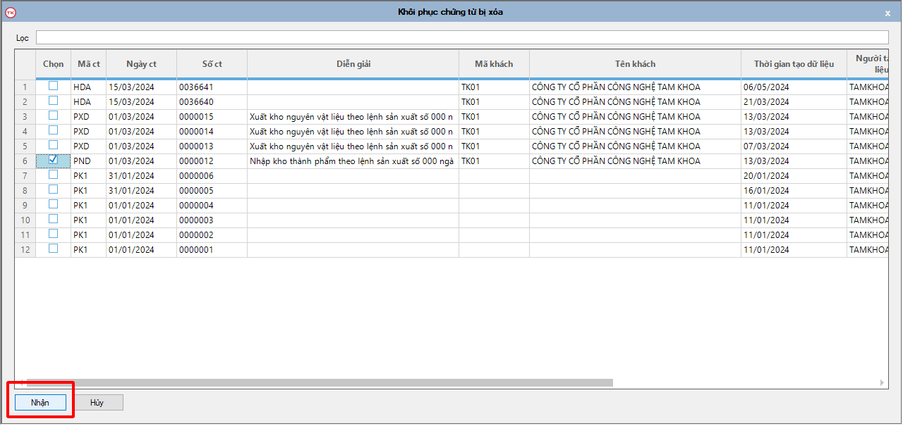Tick chọn chứng từ cần khôi phục, nhấn Nhận.