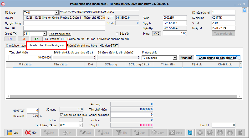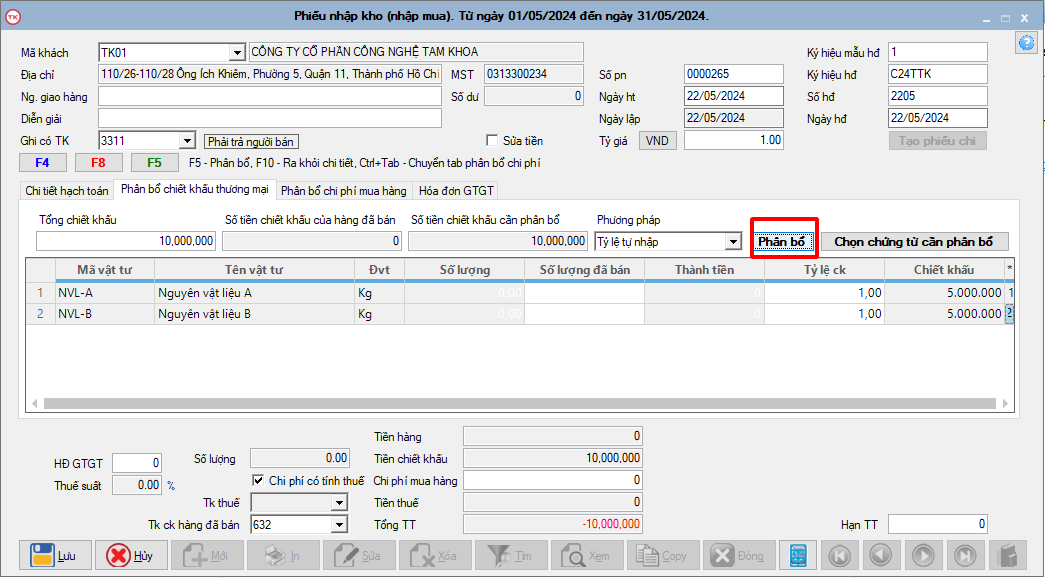 Nhập Tỷ lệ ck theo nhu cầu, bấm Phân bổ để phần mềm tự động phân bổ chiết khấu.