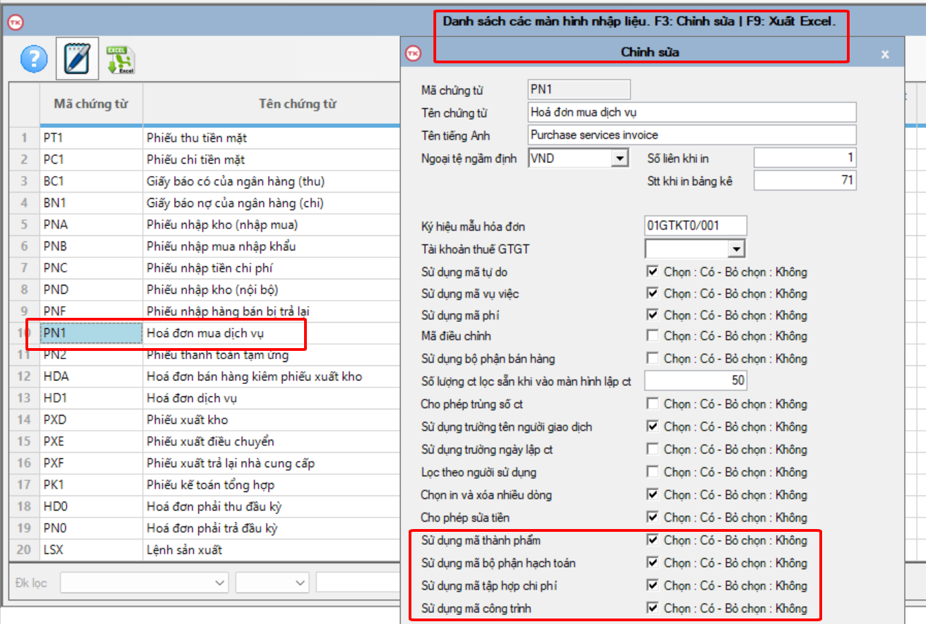 – Người dùng vào Danh sách các màn hình nhập liệu để khai thêm mã công trình và mã tập hợp chi phí cho hóa đơn mua hàng dịch vụ (phục vụ cho tính giá thành công trình)