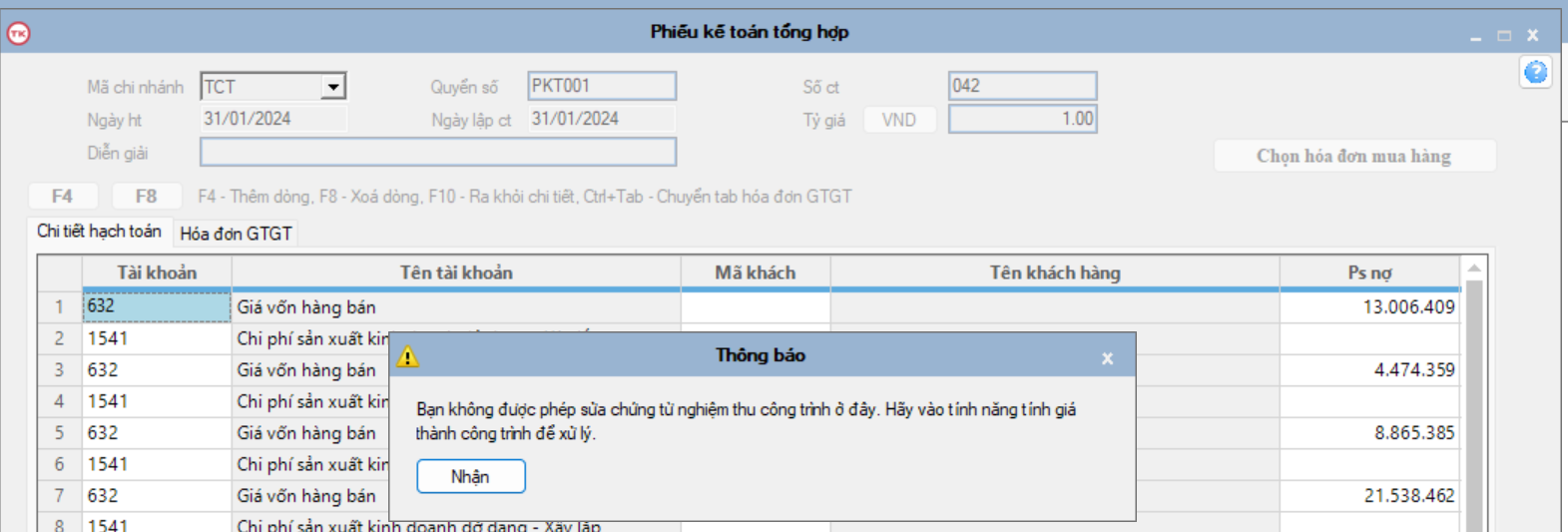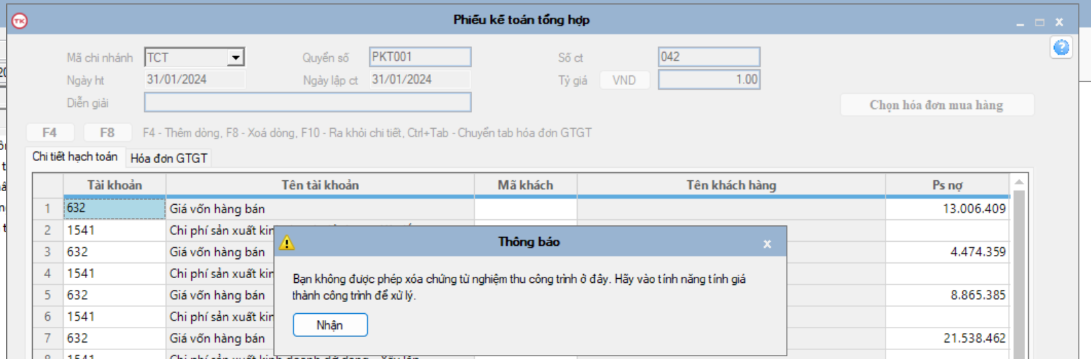 – Phiếu kế toán nghiệm thu được tạo tự động từ tính giá thành công trình sẽ không được sửa/xóa trực tiếp mà phải vào tính năng tính giá thành thực hiện xóa nghiệm thu.
