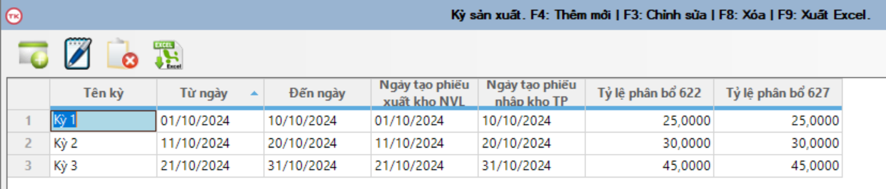 + Trong giao diện khai báo kỳ sản xuất, có các ràng buộc không cho khai báo các khoảng thời gian từ ngày đến ngày lồng nhau và đảm bảo tổng tỷ lệ phân bổ của 622 hoặc 627 phải đúng 100