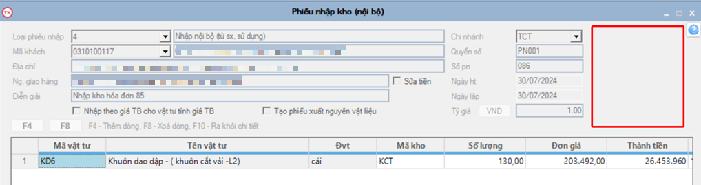 1. Giao diện phiếu nhập/xuất kho nội bộ, thêm thông tin Ngày hóa đơn, Số hóa đơn, Ký hiệu hóa đơn