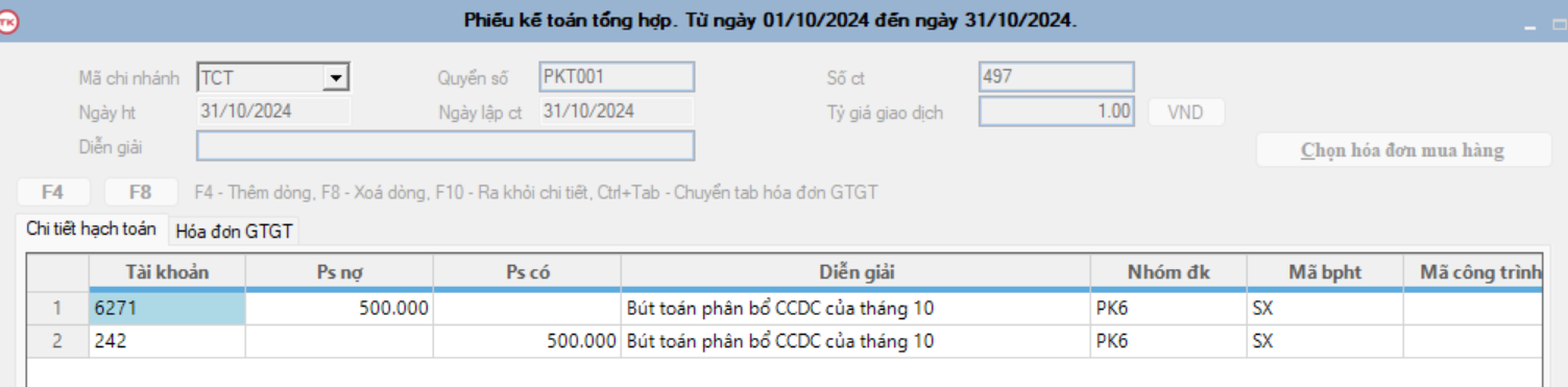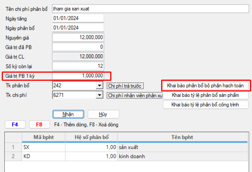 Sửa tính năng bút toán phân bổ công cụ dụng cụ, chia giá trị phân bổ theo tỷ lệ sử dụng bộ phận hạch toán (nếu có khai báo)
