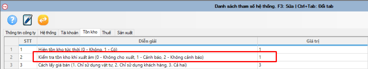 + Căn cứ khai báo “Kiểm tra tồn kho khi xuất âm” trong tham số hệ thống, phần mềm sẽ cảnh báo các vật tư âm kho
