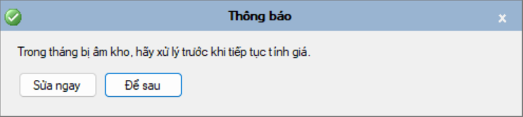 + Sau khi tính xong phần mềm thông báo tháng bị âm kho và cho phép lựa chọn sửa ngay hoặc để sau