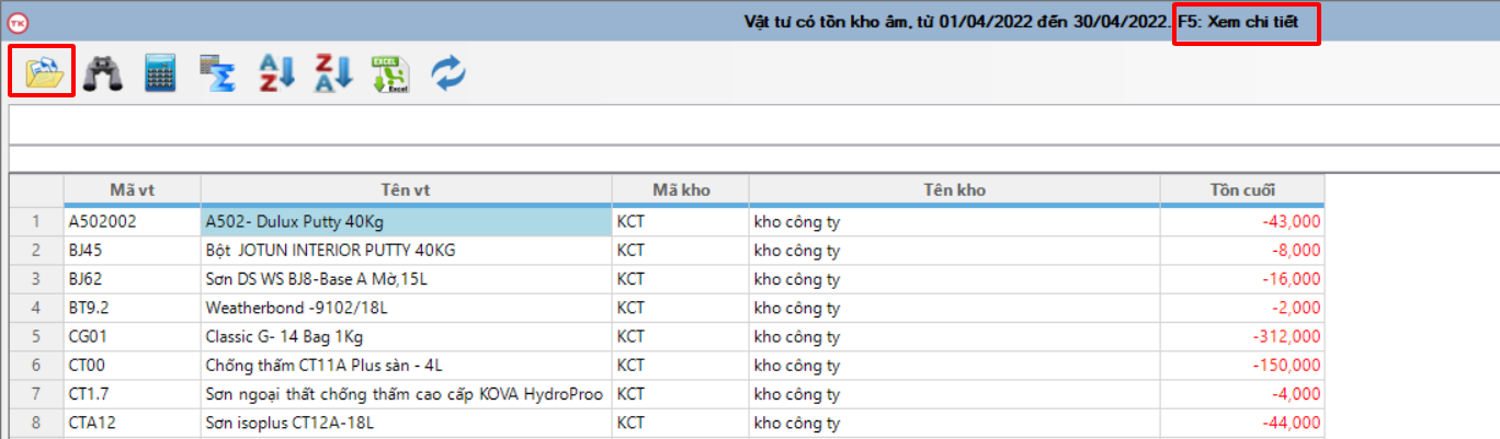 + Trường hợp chọn sửa ngay, phần mềm hiện danh sách các vật tư âm kho và cho phép xem chi tiết (F5) để chỉnh sửa ngay tại giao diện này