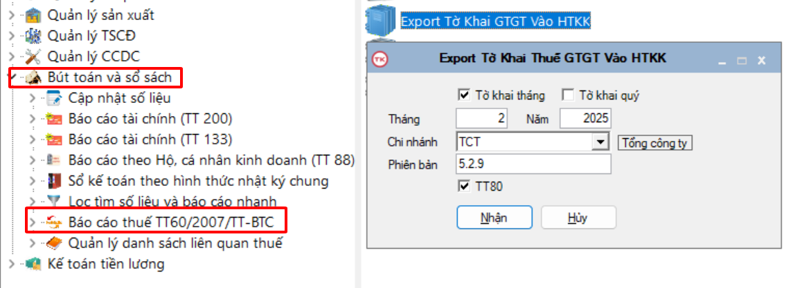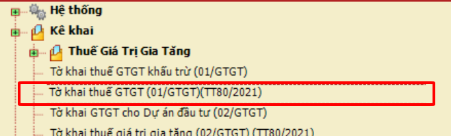 Ta vào phân hệ Bút toán sổ sách/ Báo cáo thuế TT60/2007/TT-BTC/ Export tờ khai thuế GTGT (01/GTGT)(TT80/2021)