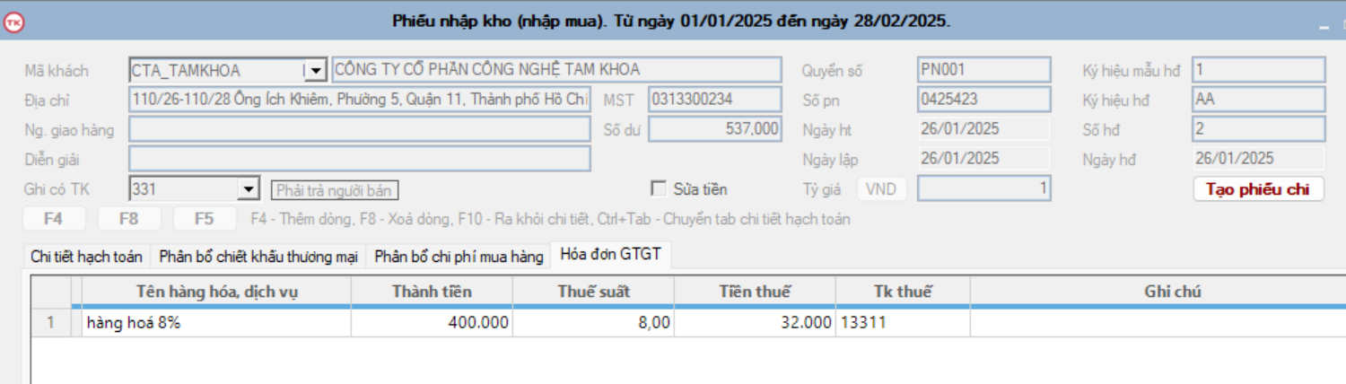 – Sau khi nhập định khoản, phần mềm tự động chọn nghiệp vụ phù hợp ứng với định khoản đó