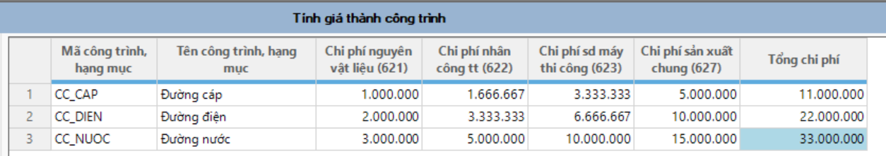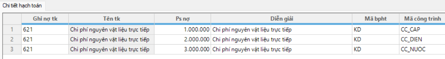 | 1 | Giá thành công trình | Thêm xử lý cho chi phí nguyên vật liệu (621) không thông qua kho (không phát sinh xuất nguyên vật liệu). |