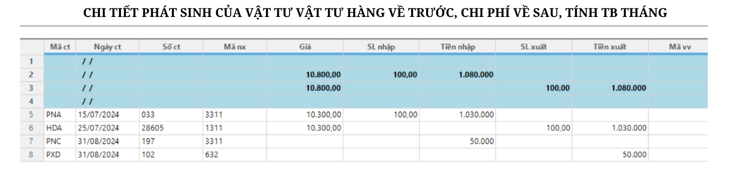 Sang tháng 8, phát sinh phiếu nhập tiền chi phí, nếu xem báo cáo tới tháng 8 thì sẽ như hình dưới, tồn kho số lượng bằng 0, tiền khác 0