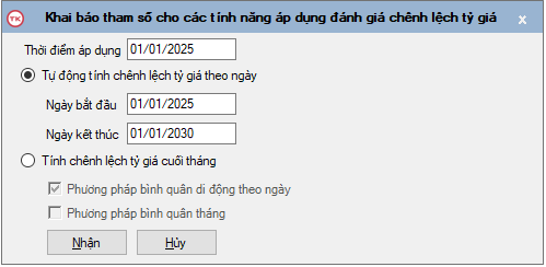 “Tự động tính chênh lệch tỷ giá theo ngày”: để áp dụng các chức năng tự động tính tỷ giá ghi sổ, tự động tính chênh lệch tỷ giá, tự động tạo bút toán hạch toán chênh lệch lãi lỗ trên từng chứng từ. Trong đó: Ngày bắt đầu và ngày kết thúc: là khoảng thời gian áp dụng tính năng.