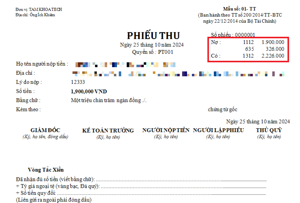 3. Mẫu in phiếu thu/chi tiền mặt bổ sung cặp định khoản chênh lệch lãi/lỗ