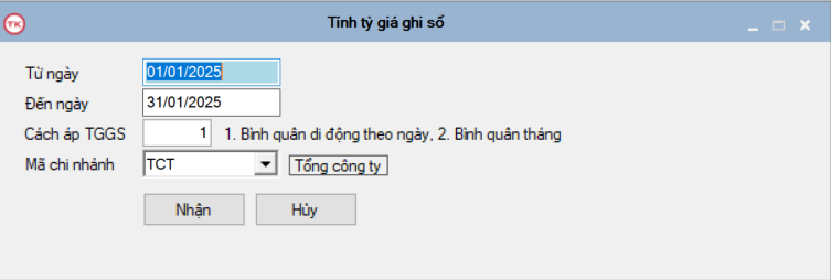 – Ô nhập Từ ngày và Đến ngày: nhập thời gian cần tính tỷ giá ghi sổ.