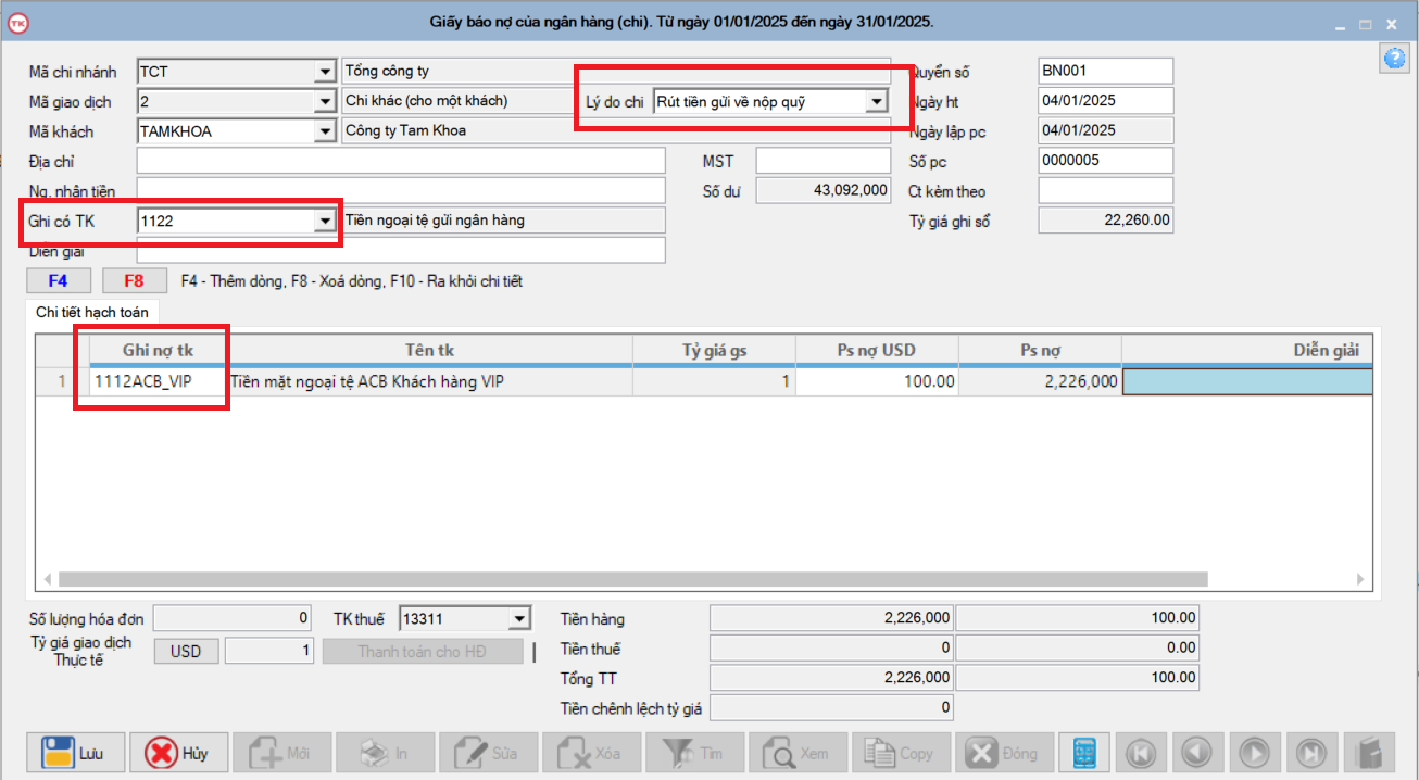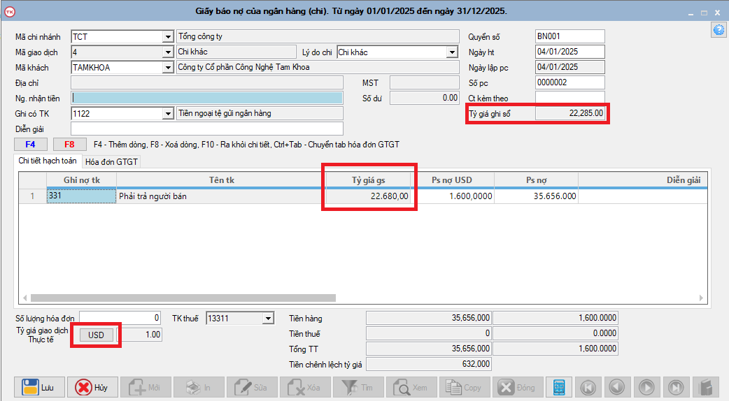 Lưu ý: Các trường hợp không cần thiết nhập tỷ giá giao dịch thực tế, phần mềm sẽ khóa lại ô nhập tỷ giá này. Ví dụ khi Tài khoản nợ và Tài khoản có đều áp dụng tỷ giá ghi sổ.