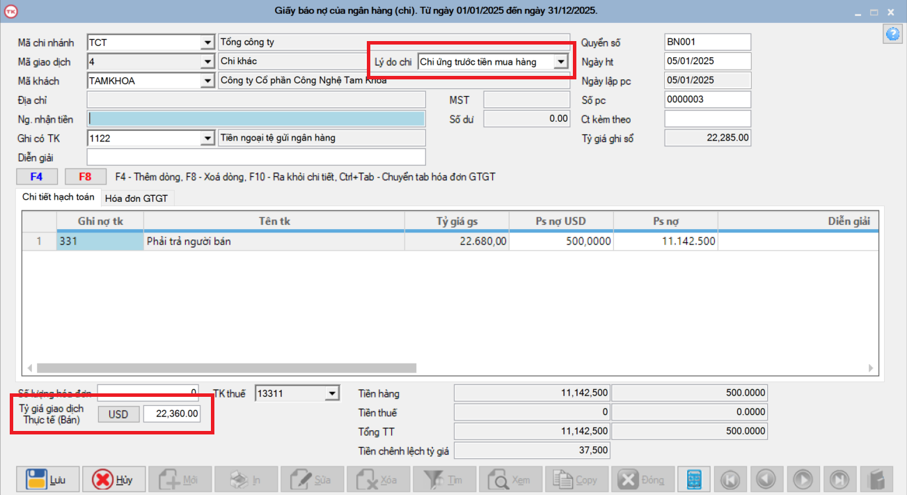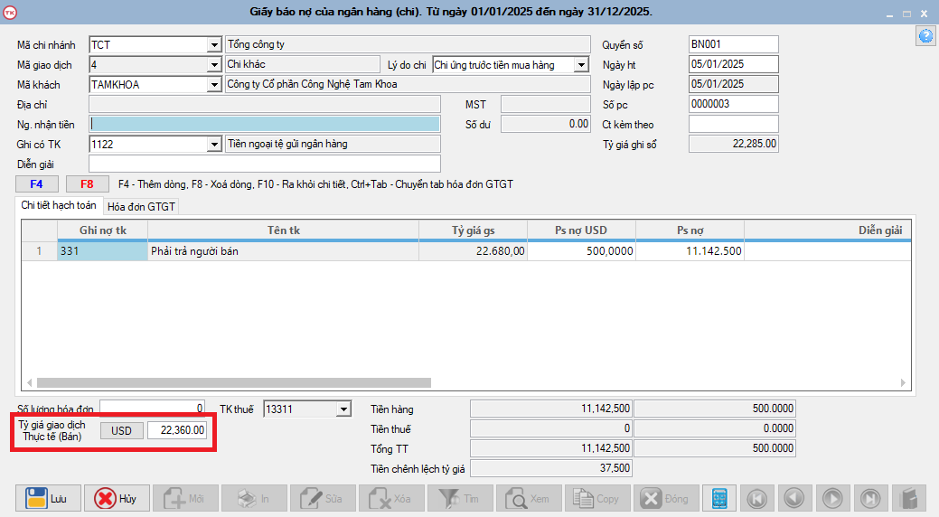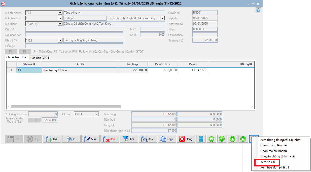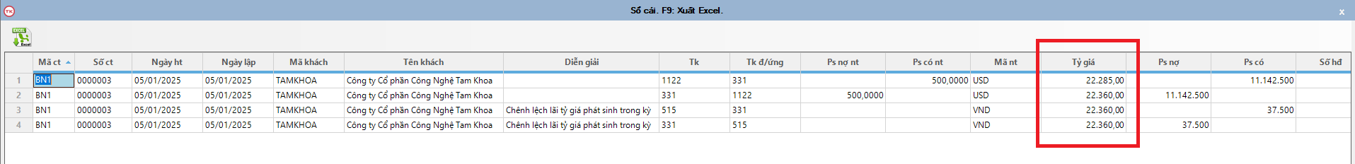 Lưu ý: Tỷ giá hiển thị trên sổ cái sẽ được xác định dựa trên loại tỷ giá được áp dụng cho chính tài khoản ghi có hoặc tài khoản ghi nợ đó. (Ví dụ tài khoản 331 đang áp dụng tỷ giá giao dịch thực tế là 22.360, tài khoản 1122 đang áp dụng tỷ giá ghi sổ là 22.285)