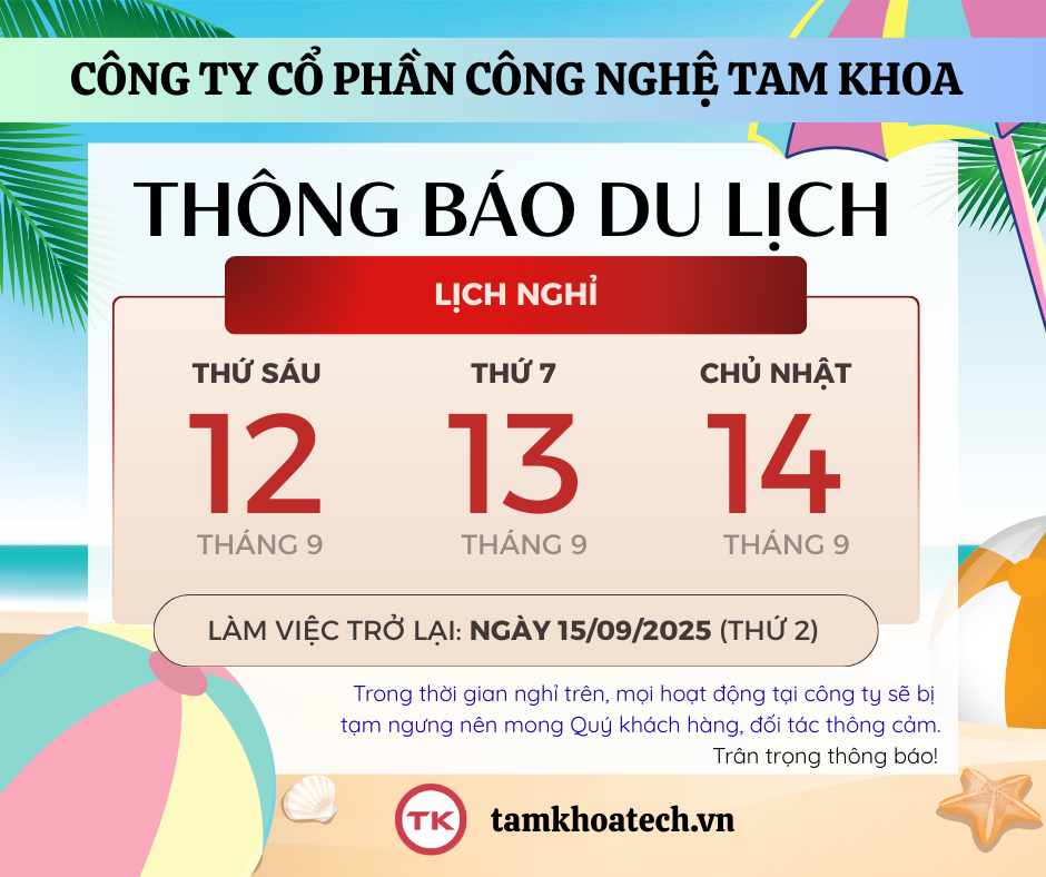 Công ty Cổ Phần Công Nghệ Tam Khoa sẽ tổ chức chương trình du lịch cho toàn thể nhân viên Công ty. Vì vậy, chúng tôi xin thông báo đến Quý khách hàng và đối tác lịch nghỉ của Công ty như sau:
