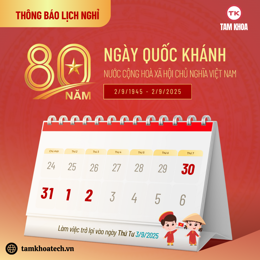 Công ty Cổ Phần Công Nghệ Tam Khoa trân trọng thông báo đến Quý khách hàng, các đối tác và toàn thể nhân viên lịch nghỉ Lễ Quốc khánh 02/09/2025 như sau: